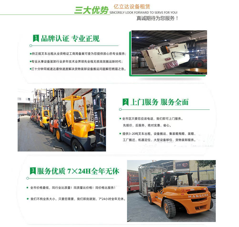 亿立达设备租赁有限公司是工商局准许的南开大学专业叉车出租公司,公司本着诚信、服务、效率、创新的经营理念,用精湛的技术,真诚的服务,为众多客户提供优质的服务,同时获得信赖与支持。专业提供南开大学3-20吨叉车出租、叉车租赁、设备搬运、集装箱掏箱装箱、机器移位定位、货物装卸、工厂搬迁、安全可靠,收费透明,价格便宜,随叫随到,24小时上门服务!本公司叉车吊车师傅对各种设备搬运装卸都有深刻探讨和研究。很多的疑难设备搬运,通过我公司的叉车师傅都能迎刃而解。对各种进口设备、国产机器、大型设备搬迁、高难度搬迁、各种精密仪器、医疗设备、科研设备等都能搬运; 提供全市 24 小时上门装卸搬运服务。同时提供厂房搬迁服务。 ...